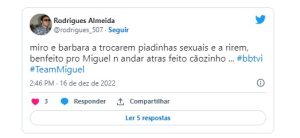 Outro pormenor que também não escapou foi o preciso momento em que Bárbara Parada bateu com a mão na massa e Miro Vemba se riu: “O que foi?“, questionou a concorrente, cujo comportamento foi rapidamente assinalado: “Miro e Bárbara a trocarem piadinhas sexuais e a rirem, benfeito para o Miguel não andar atrás feito cãozinho” ou “Bárbara bate com a mão na massa que faz um barulho peculiar, olha nos olhos do Miro e riem os dois“, são alguns comentários que se podem ler.