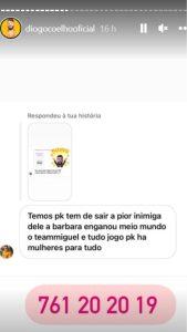 Através do Instagram de Diogo Coelho, um dos concorrentes que está em risco de expulsão, foram partilhadas várias mensagens de fãs do concorrente, onde uma delas era de ódio contra Bárbara Parada, que é também um dos concorrentes em risco, a mensagem dizia: “Tem de sair a pior inimiga dele, a Bárbara enganou meio mundo. É tudo jogo, porque há mulheres para tudo“.