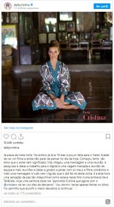 Cristina Ferreira: “Acabei de ver um filme e ainda não parei de pensar no dia de hoje. Começou lento, tão lento que o achei sem significado. Mas chegou uma mensagem e uma reunião, e pesquisas e ideias e trabalho para o digital e uma viagem marcada e reunião de equipa e mais reuniões e ideias e ginásio e jantar com os meus e filme romântico e mais uma mensagem e tudo sem vírgulas que o dia fez se desta soma.”.
