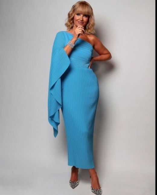 A apresentadora, de 46 anos, optou por um vestido azul e justo, que lhe realçou a silhueta. A peça é da marca Solace London e é complementada por joias Swarovski e por sandálias da Aquazzura.