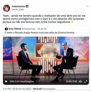 “Ainda me lembro quando o realizador de uma série para a SIC me queria como protagonista mas o Dani [Daniel Oliveira] e o seu séquito [direção] não quiseram porque eu não era famosa nem tinha muitos seguidores”, escreveu uma prestegiada atriz de teatro com provas dadas em Portugal e Espanha.