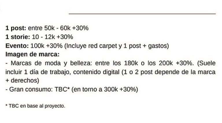 Uma publicação no feed do seu Instagram custa 50 a 60 mil euros, mas um storie já fica entre 10 a 12 mil. Já a sua presença num evento custa 100 mil euros (inclui passadeira vermelha e uma publicação).