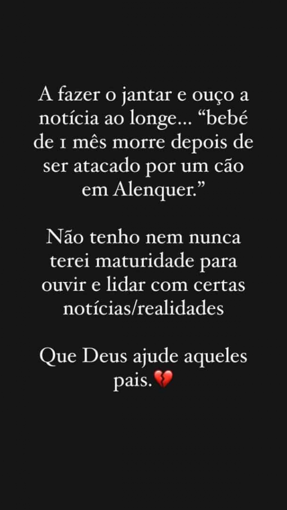 “Não tenho nem nunca terei maturidade para ouvir e lidar com certas notícias/realidades. Que Deus ajude aqueles pais”, escreveu a apresentadora, acompanhando o texto com o ‘emoji’ de um coração partido