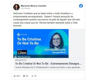 Manuela Moura Guedes: “Delicioso! Confesso que eu fiquei entre o muito divertida e o extremamente envergonhada… Sabem? Aquela sensação de confrangimento quando nos pomos na pele de alguém que não tem noção das coisas que diz. Revela também bastante sobre a Web Summit!”.