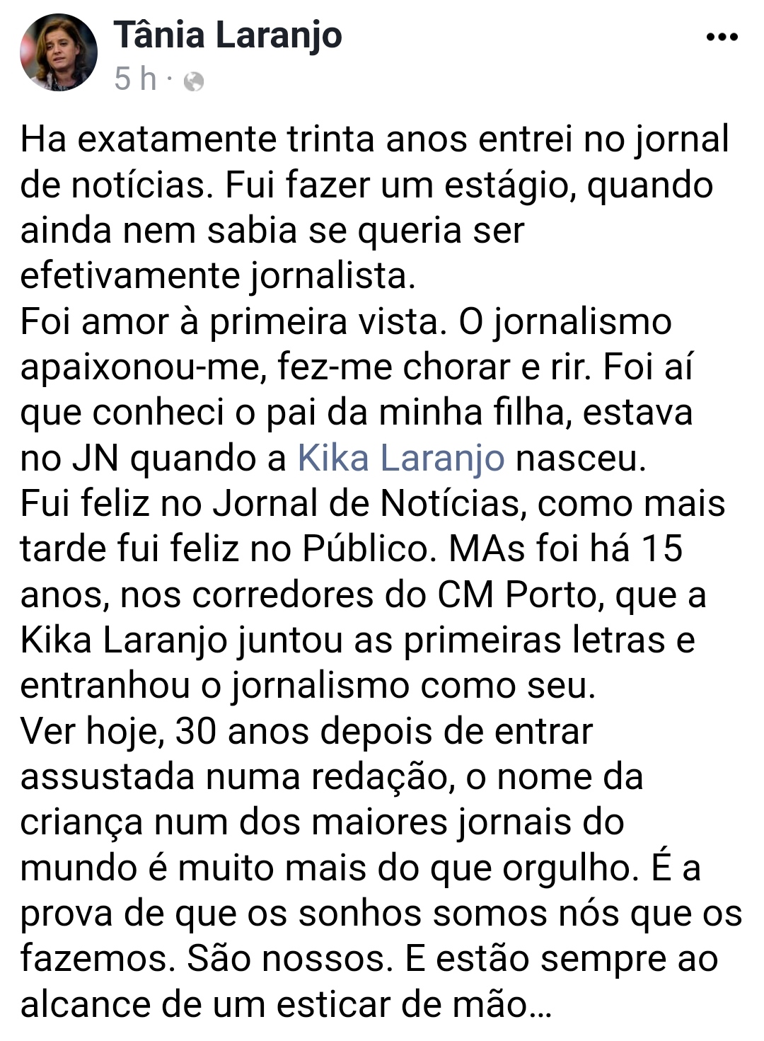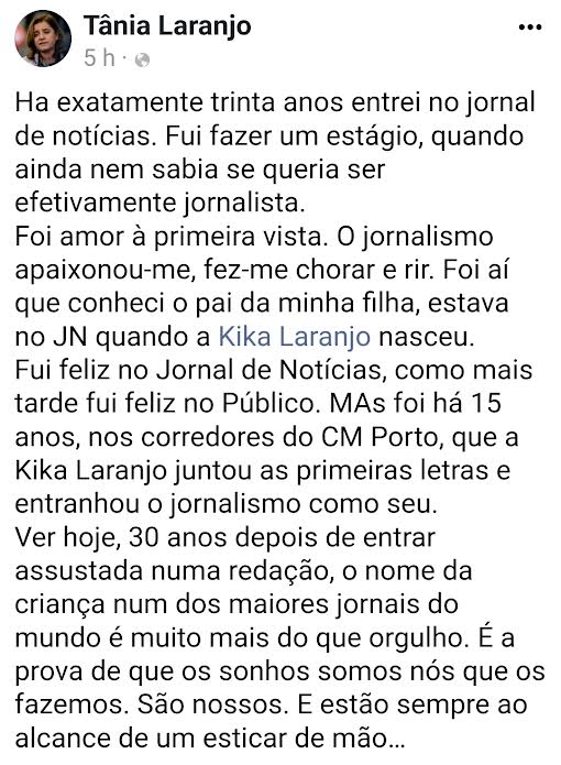 30 anos depois de ter começado como jornalista, no Jornal de Notícias, Tânia Laranjo a mais conhecida cara da CMTV vê a sua filha Francisca a iniciar a actividade também no jornalismo. O momento é assinalado com orgulho pela mãe.