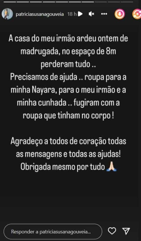 De acordo com uma publicação de Patrícia Susana, “a casa do irmão ardeu” na madrugada de quarta-feira. “Perderam tudo. Precisamos de ajuda. Roupa para a minha Nayara, para o meu irmão e para a minha cunhada. Fugiram com a roupa que tinham no corpo”, detalhou.