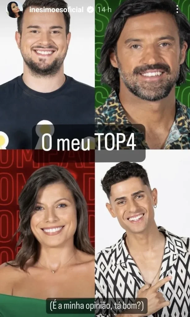 Inês Simões, atual comentadora do ‘Big Brother’, recorreu às redes sociais esta quinta-feira, dia 14 de dezembro, para revelar o seu “Top 4”.