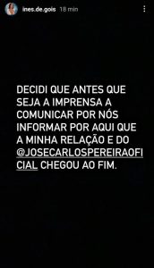 Inês de Góis referiu: “Decidi que antes que seja a imprensa a comunicar por nós, informar que a minha relação com o José Carlos Pereira chegou ao fim“.