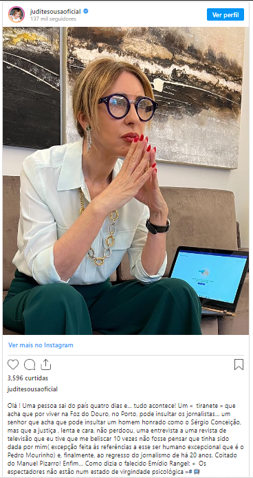 “Olá! Uma pessoa sai do país quatro dias e… tudo acontece! Um ‘tiranete’ que acha que por viver na Foz do Douro, no Porto, pode insultar os jornalistas… um senhor que acha que pode insultar um homem honrado como o Sérgio Conceição, mas que a justiça, lenta e cara, não perdoou, uma entrevista a uma revista de televisão que eu tive que me beliscar 10 vezes não fosse pensar que tinha sido dada por mim (exceção feita às referências a esse ser humano excecional que é o Pedro Mourinho)”, começou por escrever numa publicação no Instagram.