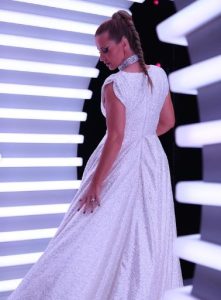 Cristina Ferreira, diretora de ficção e entretenimento da TVI optou por levar o cabelo apanhado numa trança e completou o visual com uma gargantilha em cristais, o modelo Hyperbola da Swarovski, que custa 1.000 euros.