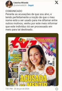 Em seguida, a ex-concorrente do Big Brother emitiu um comunicado onde promete avançar com um processo contra o ex-colega: “Perante as acusações de que sou alvo, e tendo perfeitamente a noção de que o meu nome está a ser usado para me difamar entre outros motivos, venho por este meio informar que este indivíduo irá ser processado em meio para tal destinado.”