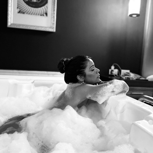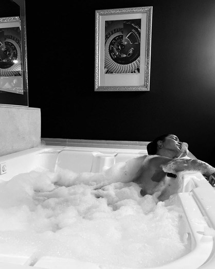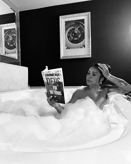 “Tomar um banho de imersão, aproveitar o tempo e o espaço, ler um livro de rajada, e dormir… A idade traz coisas maravilhosas”, diz Raquel, partilhando várias imagens sugestivas: sem roupa, numa enorme banheira num banho de espuma.