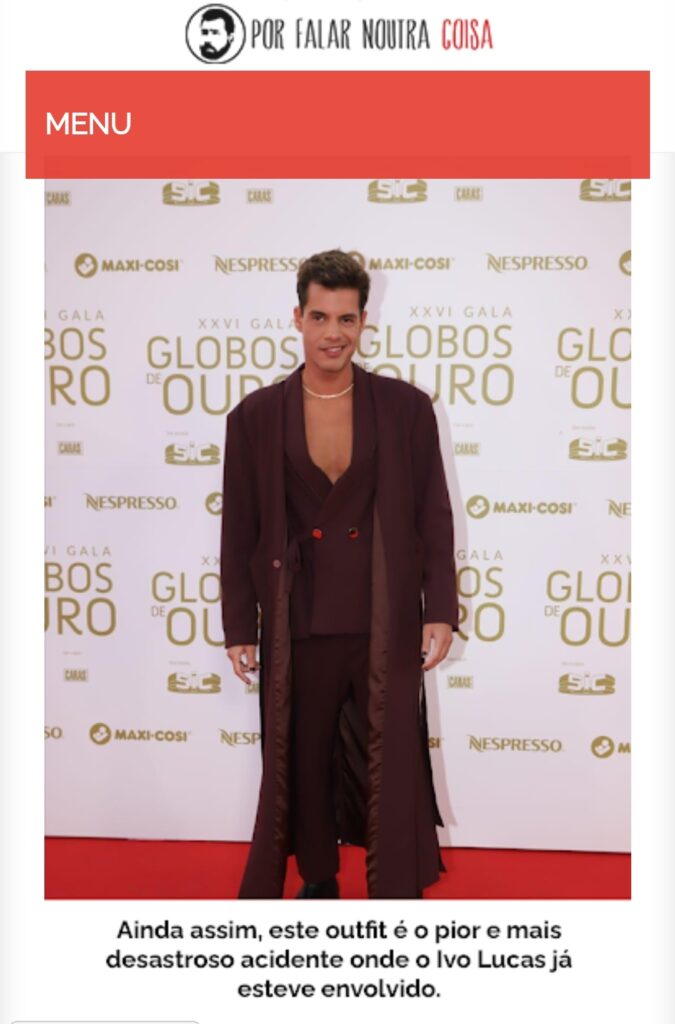 A “Pipoca Mais Doce” comentou o look de um dos vencedores da noite, Ivo Lucas, que levou para casa o prémio revelação. A antiga comentadora do “Big Brother” não “apreciou” a escolha e atirou: “Pior do que isto, só mesmo ter sido considerado “artista revelação”. Sinto que, enquanto nação, devemos um pedido de desculpas à Maro”, pode ler-se. Ivo Lucas esta ser alvo de várias criticas não só por ganhar o prémio revelação , quando já conta com 10 anos de carreira como pelo seu look. Guilherme Duarte , humorista , ao analisar o visual do artista , escreveu ” este é o pior acidente onde Ivo pode estar envolvido”