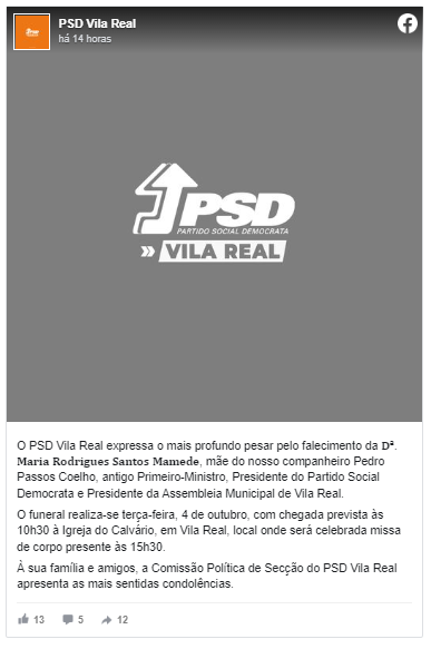 A notícia foi tornada pública numa nota de pesar publicada nas redes sociais do PSD Vila Real, que adiantou pormenores sobre as cerimónias fúnebres: “O funeral realiza-se terça-feira, 4 de outubro, com chegada prevista às 10h30 à Igreja do Calvário, em Vila Real, local onde será celebrada missa de corpo presente às 15h30”.