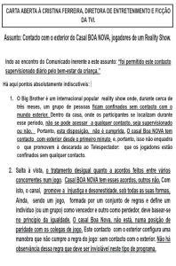 Os fãs ainda destacaram alguns “pontos absolutamente indiscutíveis”: 1. O Big Brother é um internacional popular reality show onde, durante cerca de três meses, um grupo de pessoas ficam confinados sem contacto com o mundo exterior. Dentro da casa, onde os participantes se localizam durante esse período, não se pode acessar a qualquer contacto, sela supervisionado ou não. Portanto, esta disposição. não é cumprida. O casal Boa NOVA tem contacto com exterior desde o primeiro minuto e, portanto, isso não enquadra o que promovem à descarada ao Telespectador: que os jogadores estão confinados sem qualquer contacto.