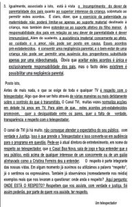“2. Salta à vista, o tratamento desigual quanto a acordos feitos entre vários concorrentes num jogo. Casal BOA NOVA tem esses acordos, outros não. Com isto, o canal, promove a iniustiça e desonestidade, sob todas as suas formas, Ainda, sendo um jogo, formada por um conjunto de regras e define um indivíduo (ou um grupo) como vencedor e outro como perdedor, deve basear-se no principio da igualdade. O casal Boa Nova, não está, numa posição de paridade com os colegas de jogo, Este contacto com o exterior configura uma manobra que não cumpre a regra do jogo: sem contacto com o exterior. Não há observancia dessa regra que deve ser inviolável neste tipo de programa.