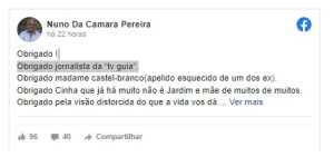Entretanto, Nuno da Câmara Pereira reagiu nas redes socias às críticas da comentadora: “Obrigado ! Obrigado jornalista da ‘tv guia’. Obrigado madame castel-branco (apelido esquecido de um dos ex). Obrigado Cinha que já há muito não é Jardim e mãe de muitos de muitos. Obrigado pela visão distorcida do que a vida vos dá”.