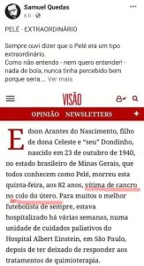 Mas em Portugal é uma gaff da revista Visão que está amplamente comentada, “sempre ouvi dizer que o Pelé era um tipo extraordinário” escreve Samuel Quedas no facebook, ao partilhar o artigo onde revista  diz que o futebolista morreu de cancro no coló do útero.