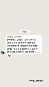 Tânia Ribas de Oliveira, apresentadora da RTP, compartilhou nas suas redes sociais para uma mensagem de um responsável na RTP, onde dizia ser um “Exemplo“: “Bom dia! Quem tem tarefas para o dia de hoje que não implique vir fisicamente à rtp pode ficar a trabalhar a partir de casa. Espero-vos bem“, pode ler-se na mensagem.