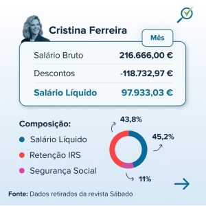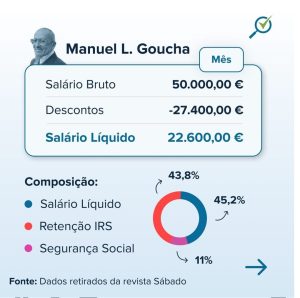 Em segundo lugar está Manuel Luís Goucha, que conduz o programa ‘Goucha’ nas tardes da TVI, e ganha 50 mil euros por mês, com perspetiva de ser aumentado com a renovação do contrato. Mas o que nunca foi revelado , é o que realmente levam para casa “liquido” estas duas celebridades . O site Compara Já , fez a análise real de cálculos da folha de vencimentos de ambos . Goucha por exemplo deixa ficar mais de metade em imposto e líquidos leva “apenas” 22.600 €. Já Cristina Ferreira , depois de impostos debitados , fica com menos de 100 mil euros mês.