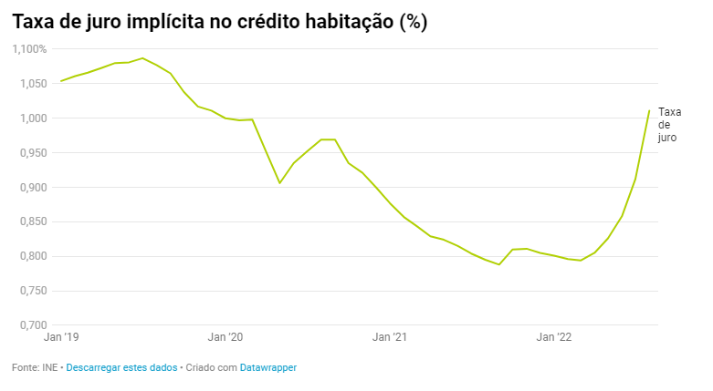 Com a subida da Euribor para todos os prazos, a taxa de juro implícita nos créditos habitação está a ficar mais elevada há cinco meses consecutivos, tendo atingido os 1,011% em agosto, segundo os dados mais recentes do INE.